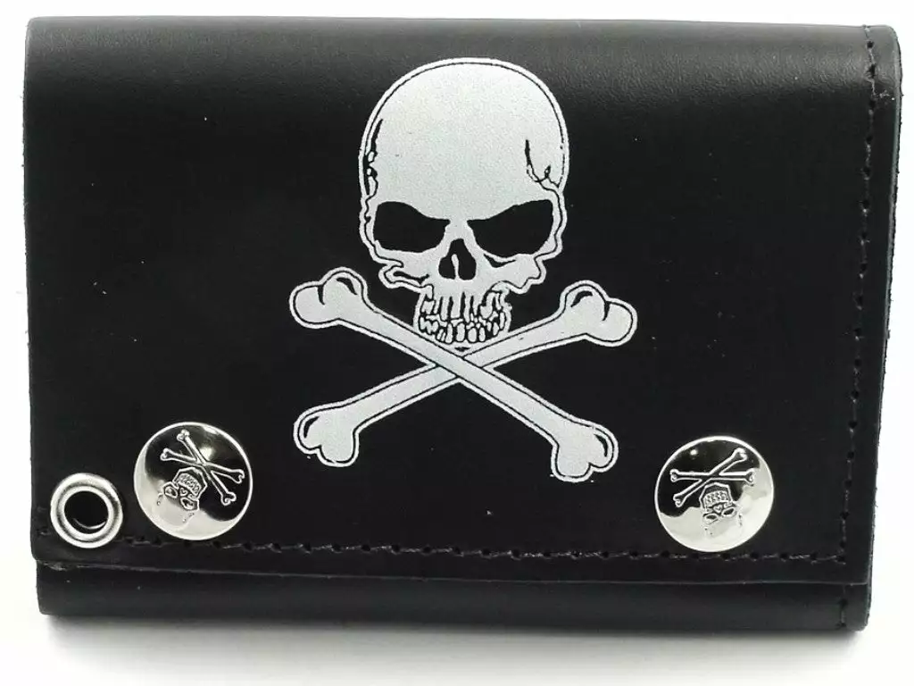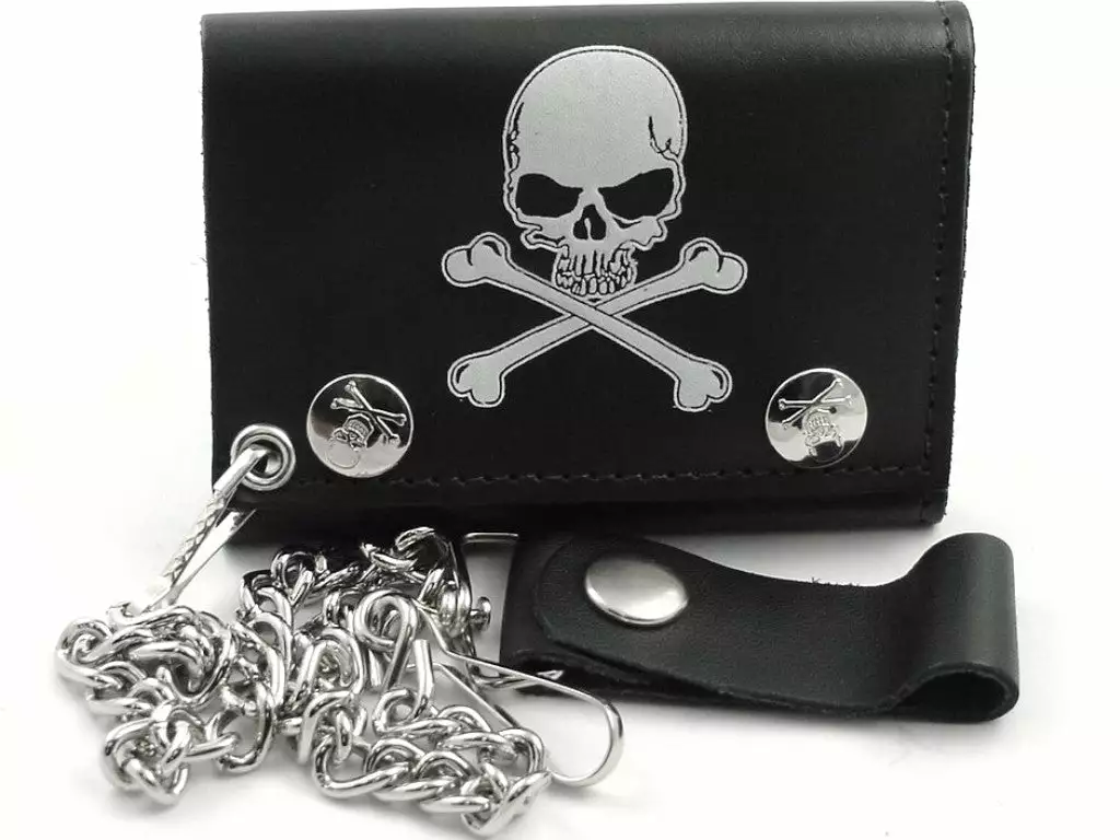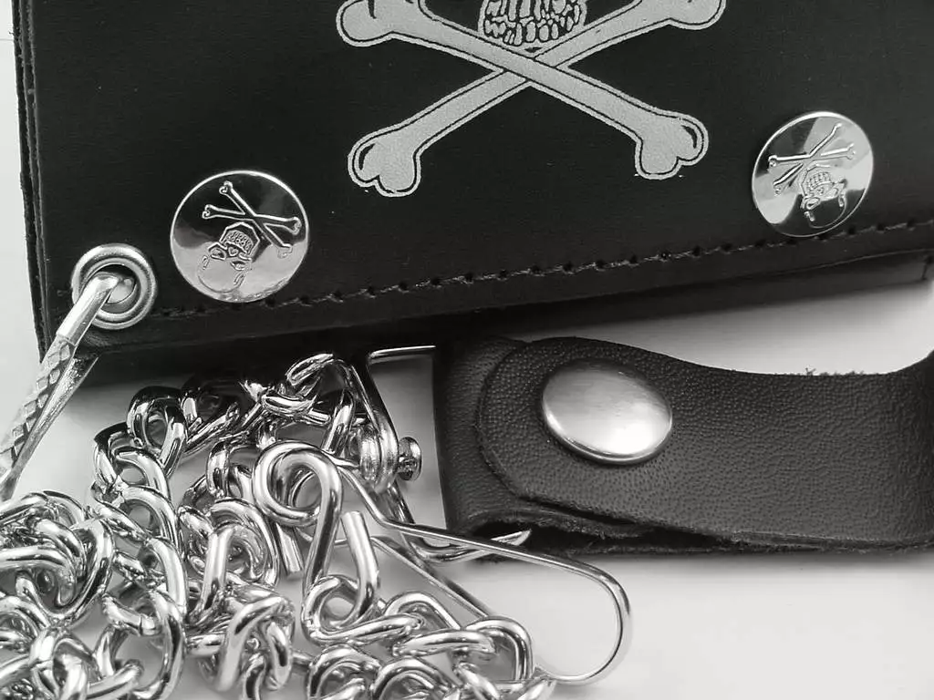 Skull & Crossbone Genuine Leather Chain Wallet. Our Genuine Leather Chain Wallets Are made with you in mind, with all the compartments you need for all your valuables, money, credit cards ID cards and photos all in one great looking secure place. Made of 100% real leather these wallets are beefy and tough and of course look great! This Wallet comes complete with a removable 17” chrome chain that easily clips to a sturdy corner rivet on the wallet. This wallet can be used with the chain or without. To attach this chain wallet to you pants simply snap the leather button hoop to the front belt loop of your pants. This wallet is a great fashion statement but also secures your wallet and belongings safely to you making theft or loss of your wallet nearly impossible. the chain also features a loose clip that is perfect for attaching your keys keeping them safe and secure as well. The wallet itself features 4 separate compartments including 2 for your credit cards and IDs, one for pictures that holds 12 wallet sized photos and one over sized money compartment on the top that is big enough to hold any kind of international currency.