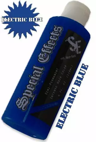 Special Effects Hair Dye -Electric Blue. Special Effects Hair dye is available in 20 delicious semi-perminant colors. Our Amazing cream conditioning formula is made from the finest ingredients on the planet and is never tested on animals. Special Effects hair dye lasts 3 to 6 weeks on most hair. Made in the USA.