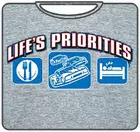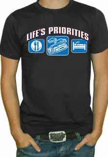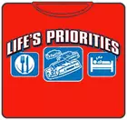 Lifes Priorities Racing T-Shirt. Exclusively from Bewild.com, these new tee’s feature hard-core sayings that say it all. From “Lick Here For Full View” to “Skanky white-trailer trash”. How about a t-shirt that says “Dip me in Chocolate and throw me to the lesbians?” Our short sleeve “Lifes Priorities Racing” t-shirts are made from a 100% fully machine washable preshrunk cotton for a cool and comfortable fit every time.