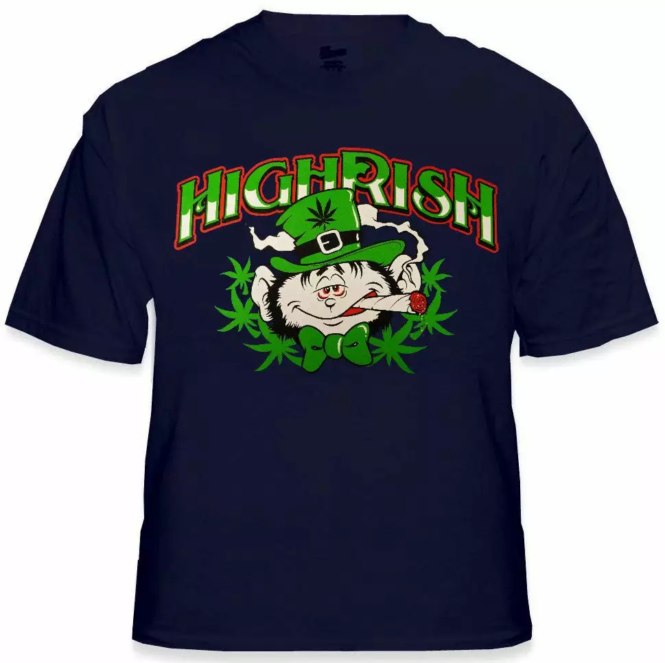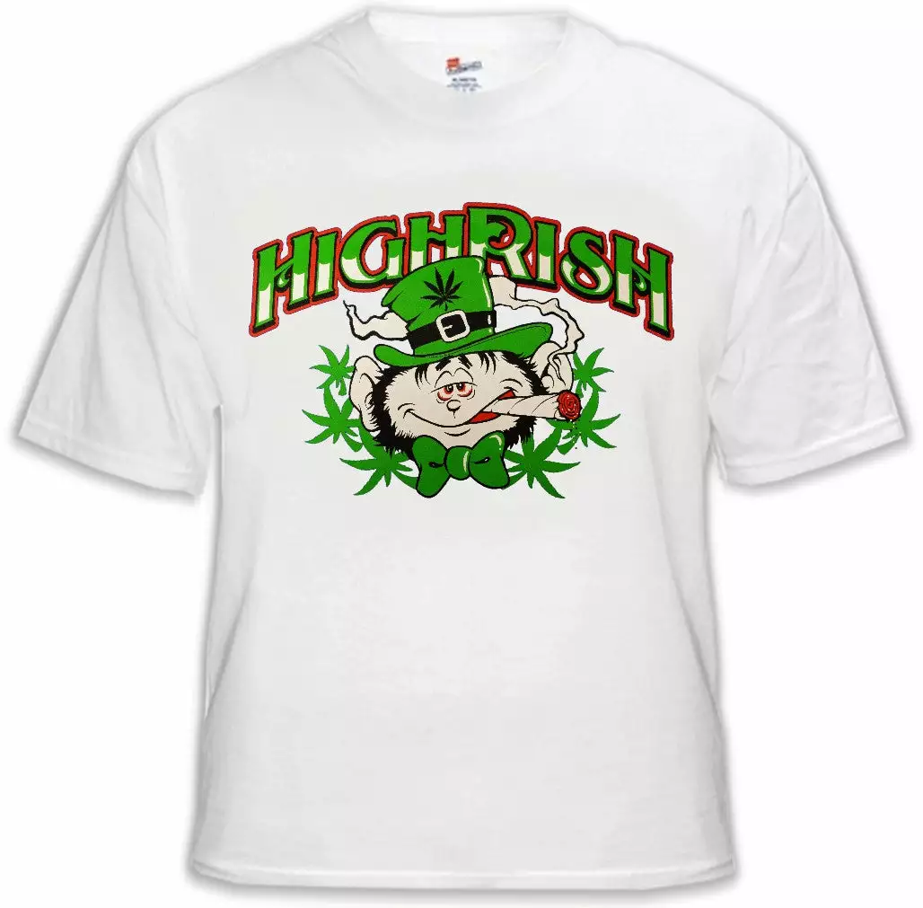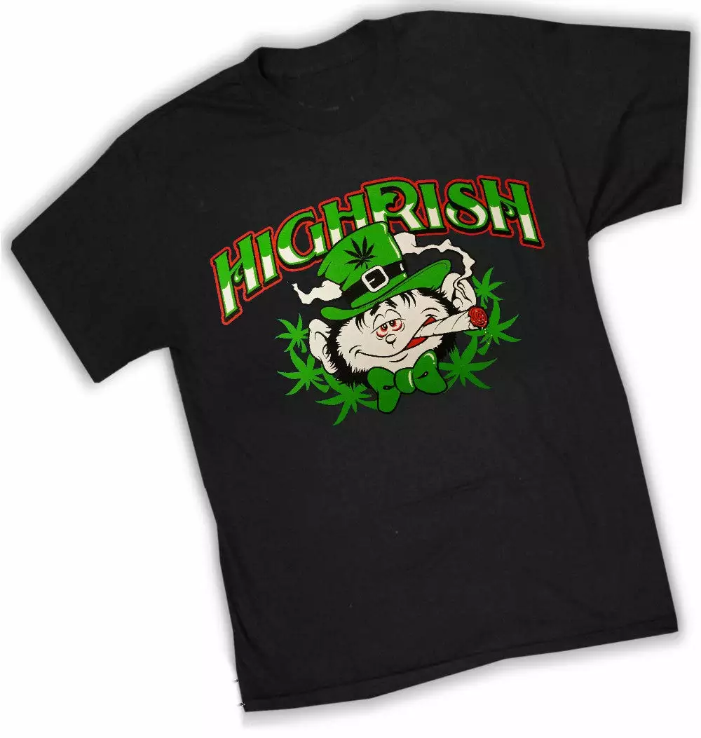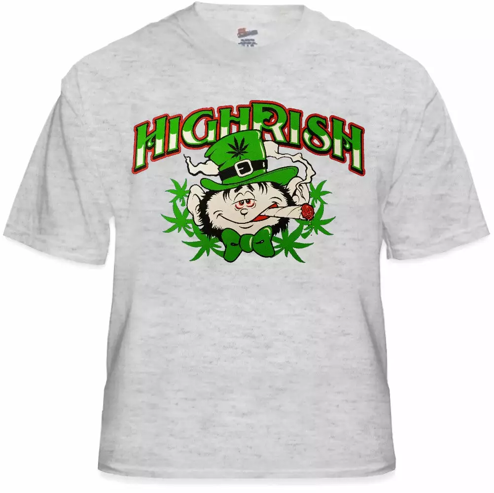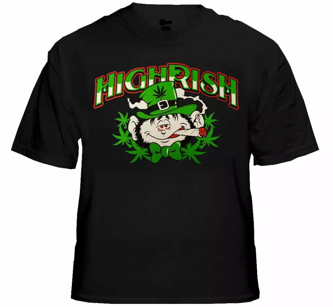 Irish Pothead T-Shirt – Highrish Stoned Leprechaun T-Shirt. For all the pot smokin’ Irishman out there this shirt is just for you! This shirt features a stoned Leprechaun smoking a joint on the front of the shirt with the novel saying “Highrish” above. The design is topped of with a bounty of pot leaves beneath the leprechaun. This design is printed on a deluxe cotton t-shirt in your choice of color.