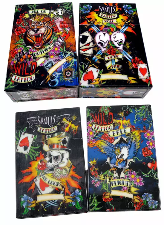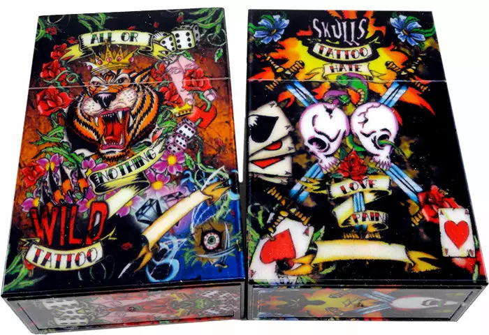 Tattoo Style Cigarette Box (For King Size Cigarettes). These premium quality hard pack cigarette cases are perfect for any regular pack of cigarettes. To use the case simply slide an open pack of cigarettes in to the case. Your cigarettes pick be protected from being crushed. This pack also keeps your cigarettes fresher for longer. No more crushed packs! Tattoo Style cigarette Box also adds a stylish accent to your boring cigarette pack. Touch to open! Getting your cigarettes out of this pack is easy, just touch the latch and it pops open, and best of all it stays closed untill you open it. Makes a great gift, Ships In assorted designs