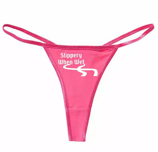 Ladies be prepared to see jaws drop with our new sexy thong underwear! Every pair of our sexy thong panties feature a funny saying like this “Slippery When Wet” Thong. The perfect addition to any intimate outfit. Of course, they look incredible all by themselves as well. All of Bewild’s thongs are Made in the USA from soft 100% cotton and are machine washable.