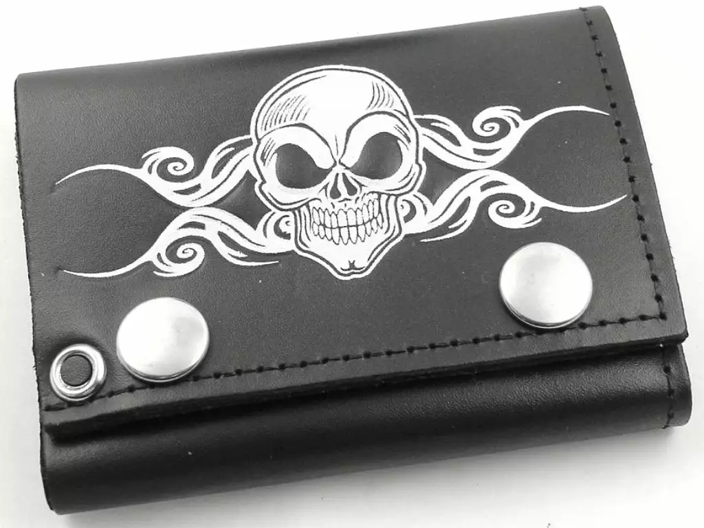 Death Skull Genuine Leather Chain Wallet. Our Genuine Leather Chain Wallets Are made with you in mind, with all the compartments you need for all your valuables, money, credit cards ID cards and photos all in one great looking secure place. Made of 100% real leather these wallets are beefy and tough and of course look great! This Wallet comes complete with a removable 17” chrome chain that easily clips to a sturdy corner rivet on the wallet. This wallet can be used with the chain or without. To attach this chain wallet to you pants simply snap the leather button hoop to the front belt loop of your pants. This wallet is a great fashion statement but also secures your wallet and belongings safely to you making theft or loss of your wallet nearly impossible. the chain also features a loose clip that is perfect for attaching your keys keeping them safe and secure as well. The wallet itself features 4 separate compartments including 2 for your credit cards and IDs, one for pictures that holds 12 wallet sized photos and one over sized money compartment on the top that is big enough to hold any kind of international currency.