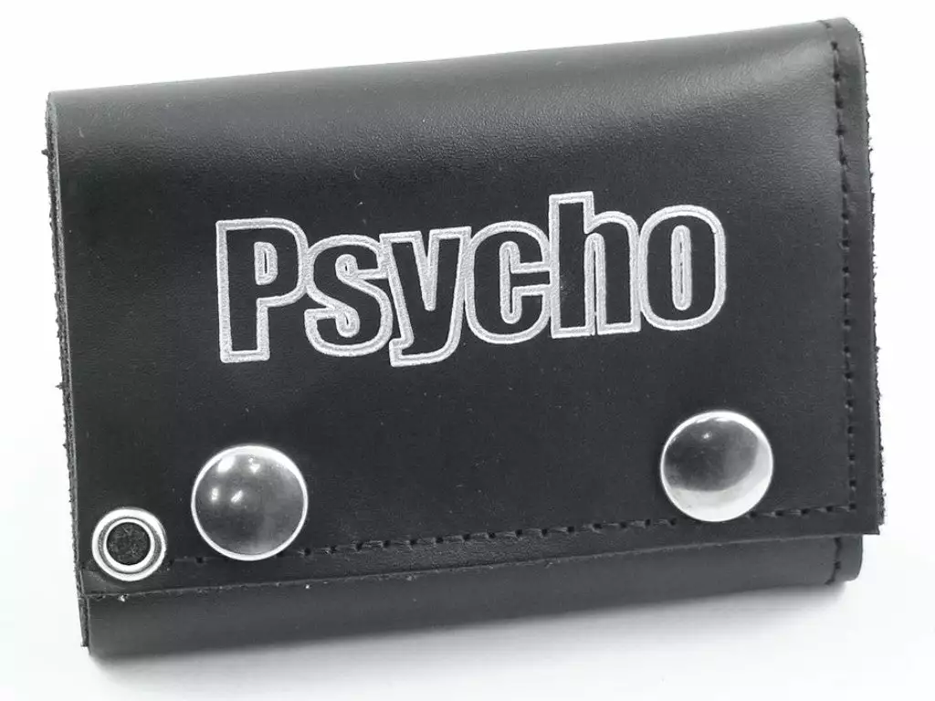 Psycho Genuine Leather Chain Wallet.Our Genuine Leather Chain Wallets Are made with you in mind, with all the compartments you need for all your valuables, money, credit cards ID cards and photos all in one great looking secure place. Made of 100% real leather these wallets are beefy and tough and of course look great! This Wallet comes complete with a removable 17” chrome chain that easily clips to a sturdy corner rivet on the wallet. This wallet can be used with the chain or without. To attach this chain wallet to you pants simply snap the leather button hoop to the front belt loop of your pants. This wallet is a great fashion statement but also secures your wallet and belongings safely to you making theft or loss of your wallet nearly impossible. the chain also features a loose clip that is perfect for attaching your keys keeping them safe and secure as well. The wallet itself features 4 separate compartments including 2 for your credit cards and IDs, one for pictures that holds 12 wallet sized photos and one over sized money compartment on the top that is big enough to hold any kind of international currency.