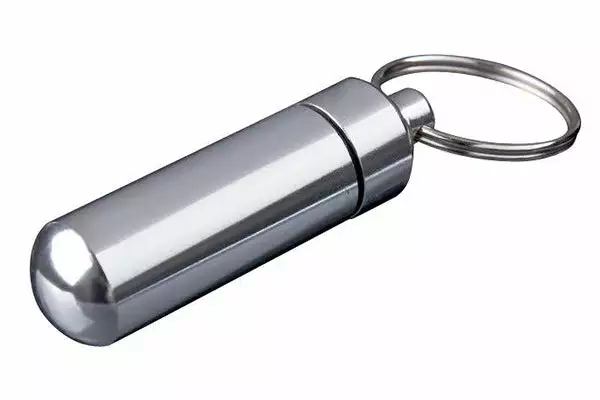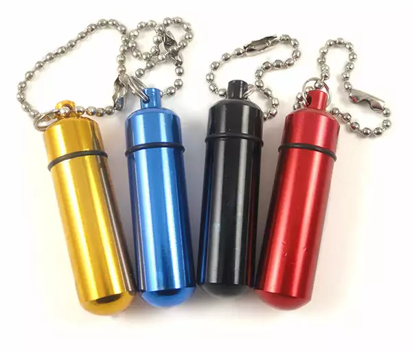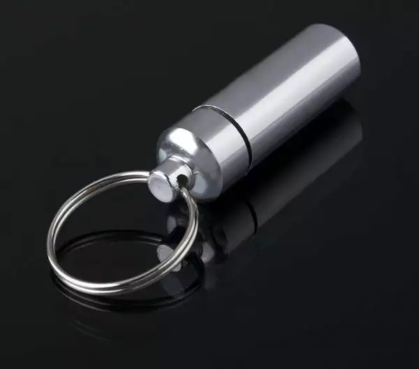 Whatever it is that you need to carry this cool keychain has an air tight screw on cap With a rubber o ring to carry, conceal, and protect your stash from whatever “inclement weather” that may come your way