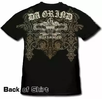 This Dark t-shirt features the Power vs Force design. A Gothic skull with the word Power overlaps the left shoulder and a Gothic skull with the work Force decorates the right. On the Back is the Da Grind Unlimited Logo design. You are sure to be noticed in this shirt.