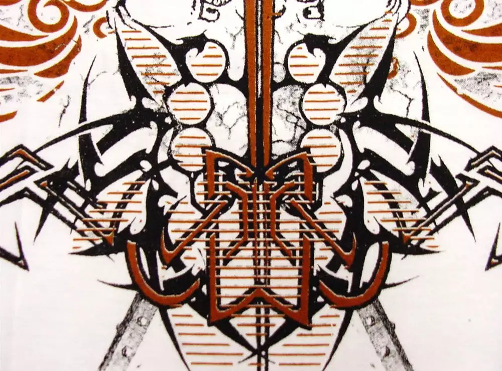 This white t-shirt has a large design featuring a tribal excaliber sword guilded in gold foil with the words “Super Bad Deception”. This shirt also features a hanging spider web with a wicked black widow spider. The back of this shirt contains many subtle details including another large excaliber sword, more black widow spiders, tribal designs and the quote “super bad deception”. Through out the entire design there is gold foiled accents for an extra cool look. You are sure to be noticed in this shirt.