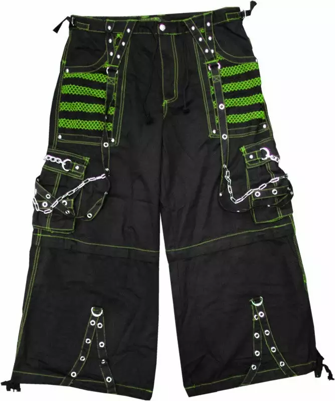Tripp NYC “Armageddon II” Bondage Pants. These pants have it all, Chrome Steel Chains, metal zippers, worn steel accents and super unique black and Toxic Green material. Tripp NYC “Armageddon II” Bondage Pants Feature deep front pockets, oversized back pockets and decorated cargo pockets and have enough storage to fit all your goodies and baddies. All the straps on the Tripp NYC “Armageddon” Bondage Pants are removable, just in case you want to tone down the look, but why would you want to do that? Draw sting waist and bottoms mean the pants are going to fit you PERFECT. Need we say more?